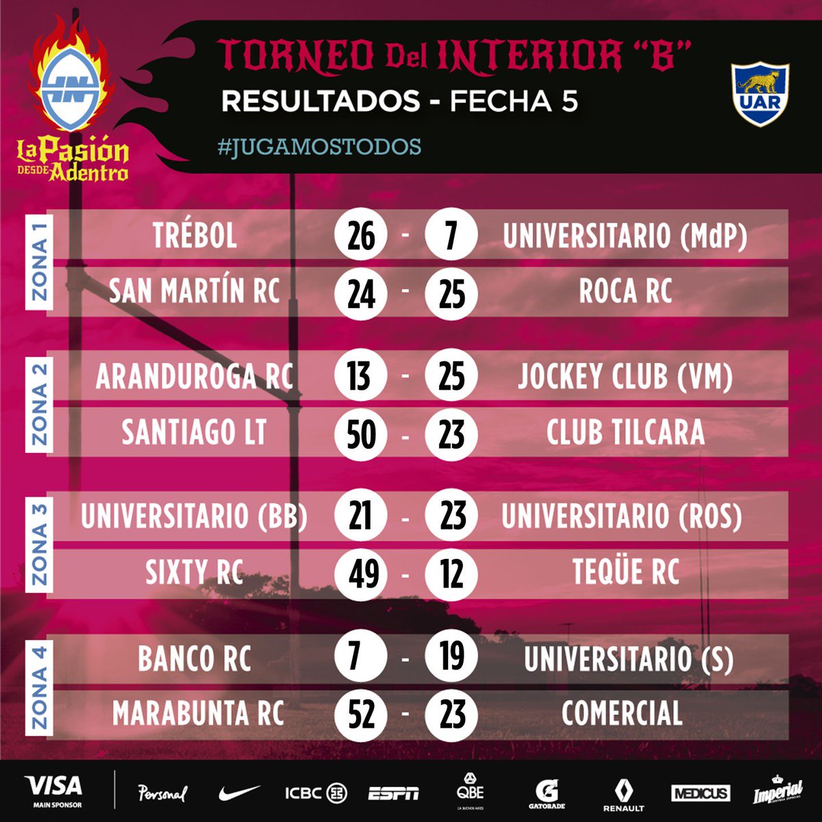 Trébol de Paysandú, Jockey de Villa María, Santiago Lawn Tennis, Teque RC, Universitario de Salta y Marabunta se aseguraron su lugar en los play-off del campeonato.