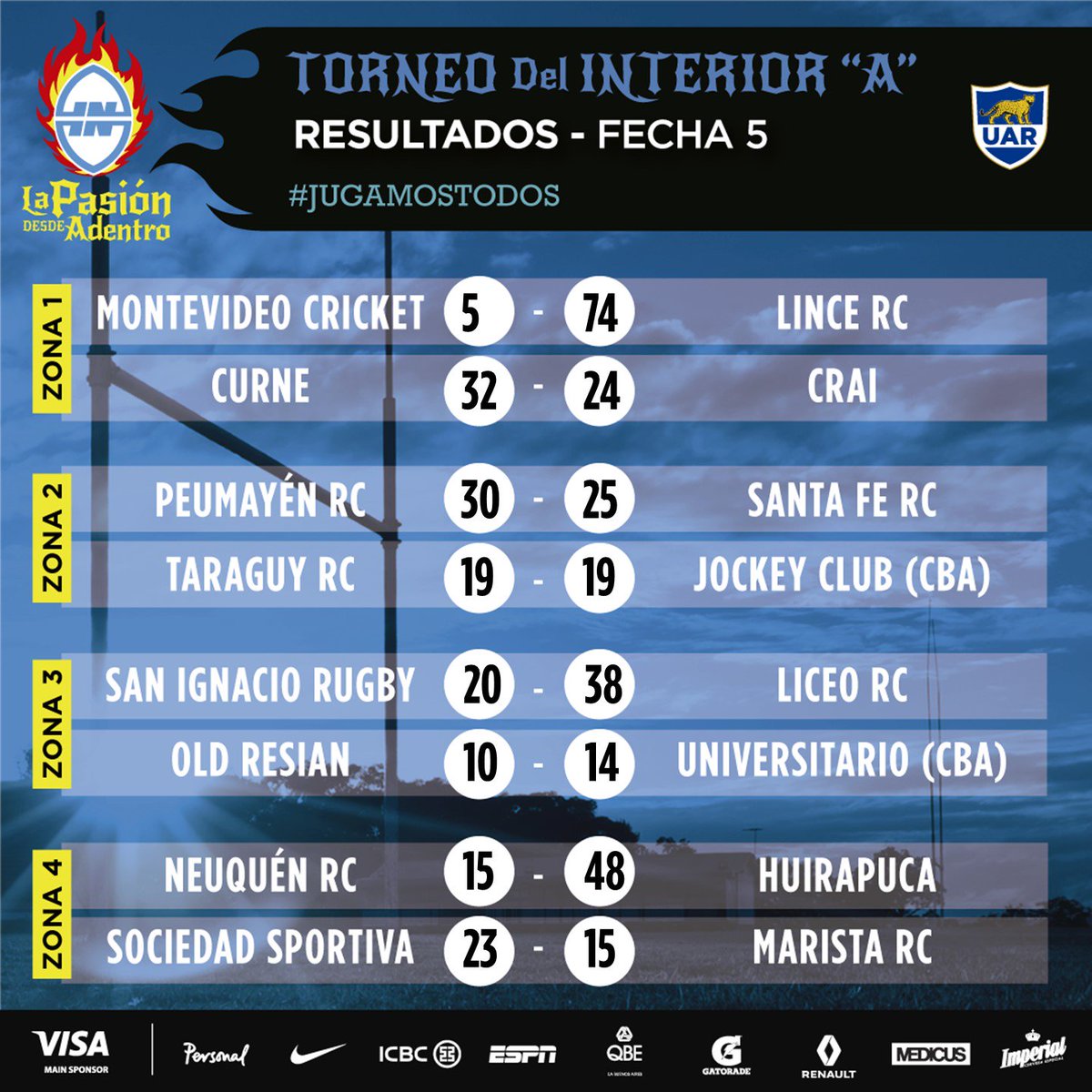 El conjunto de Tortuguitas sufrió, pero salió airoso de su visita a Rosario y se terminó imponiendo por 26-23 ante Jockey. Santiago Montagner aportó dos tries para el último finalista de la URBA. En ese mismo grupo Tucumán Rugby venció 21-15 al SIC, que sumando un punto en la última fecha ante Alumni, se aseguraría un lugar en las definiciones. Hindú se trajo un triunfazo en la cancha de Duendes y seguirá en la pelea por el título. El hombre de Jaguares, Felipe Ezcurra, aportó uno de los tries para el club de Don Torcuato, que irá en busca del tetracampeonato. Al enfrentarse entre sí en la última fecha Duendes y Tucumán Tennis, uno de los dos no podría superar los 14 puntos que tienen los dirigidos por Lucas Ostiglia. Los tucumanos superaron a CUBA por 36-19, y de esta manera el universitario se convirtió en el único equipo de Buenos Aires eliminado hasta el momento.