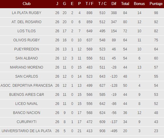 Deportiva Francesa se aseguró la permanencia en la División A luego del triunfazo en condición de visitante sobre Atlético del Rosario. Banco Nación derrotó a San Carlos, evitó el descenso directo y jugará el repechaje. Curupaytí ganó, pero no le alcanzó y jugará la próxima temporada en la División B. La Plata Rugby superó a Biei y se consagró campeón de la categoría.