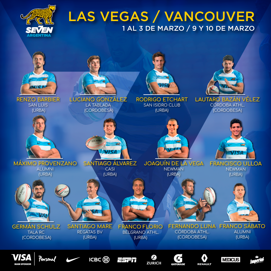 Los Pumas 7s tendrán tres posibles debutantes: Joaquín De la Vega, Francisco Ulloa (ambos de Newman) y Franco Florio (Belgrano Athletic) con la particularidad de que ninguno de los tres se afianzó en la primera de su club. Ulloa, el último en sumarse, reemplazará al capitán Gastón Revol que sufrió un desgarro y se pierde esta gira.