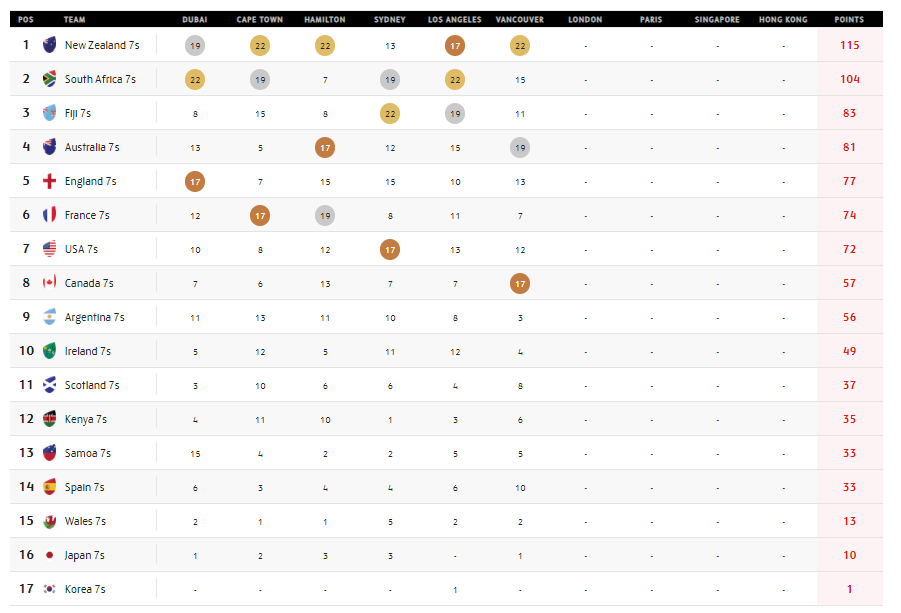 Tras seis torneos disputados, la temporadas 2019/2020 llegó a su fin. Una decisión lógica, teniendo en cuenta la incertidumbre general. En un principio se había especulado continuarla en septiembre pero finalmente no se reanudará. Nueva Zelanda, el puntero hasta la etapa de Vancouver, es el nuevo campeón. Los hombres de negro venían teniendo un gran año, ganando tres torneos (Ciudad del Cabo, Hamilton y Vancouver) y metiéndose en el podio en otros dos (Plata en Dubai y Bronce en Los Ángeles). Quizás sin las figuras rutilantes de otros tiempos, pero con un equipo muy parejo en todas sus líneas y muy regular. Nombres destacados como Tim Mikkelson, Regan Ware, Joe Ravouvou, Scott Curry, Sam Dickson y Kurt Baker, por nombrar algunos. También tuvo buena participación Caleb Clarke, la sensación del Super Rugby Aotearoa y figura el últimos fin de semana con Blues. Está claro que no es la mejor manera de ganar, pero Nueva Zelanda rompe una sequía de 5 años sin quedarse con el circuito. Mucho tiempo para un seleccionado de que 21 temporadas ganó 13 y vio como Fiji y Sudáfrica dominaron la competencia en el último lustro. Aunque es cierto que en el medio se consagró campeón en el Mundial de San Francisco tras derrotar en la final a Inglaterra.