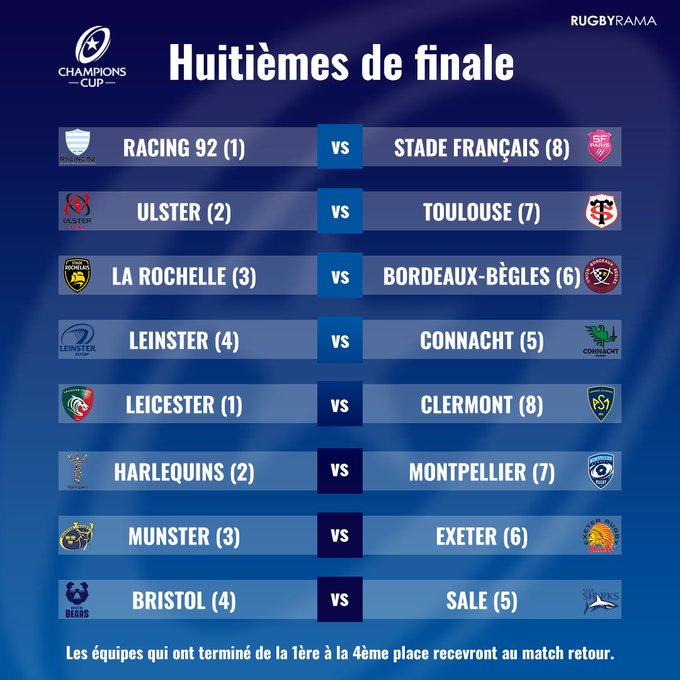 La Champions Cup se reanudará después del 6 Naciones. El 8/9/10 de abril se jugarán los primeros partidos de los octavos de final, que serán ida y vuelta (a partir de cuartos será un partido solo). Se destaca el derbi de París, un lindo choque entre La Rochelle-Bordeaux, dos semifinalistas en 2021, y Leicester Tigers-Clermont, con la vuelta de Tomás Lavanini a Welford Road.