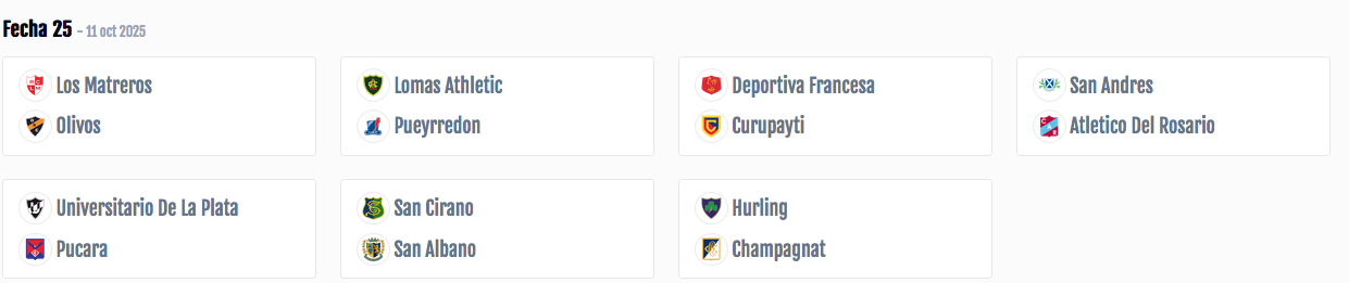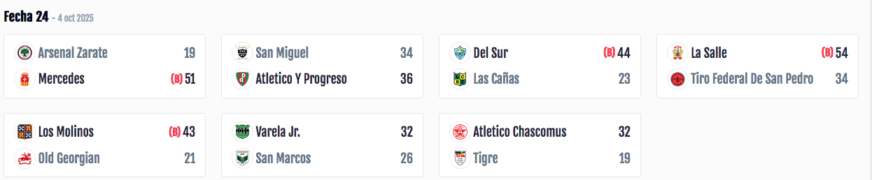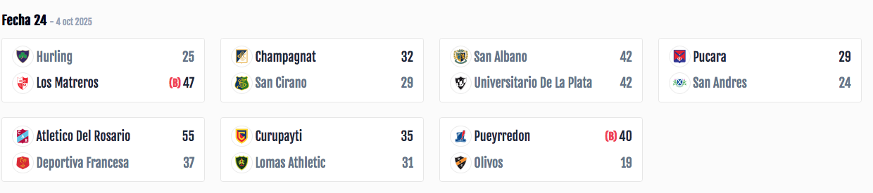 Primera A, duelo del 3° vs el 4° .Champagnat vs San Cirano. Este ultimo venia de 13 victorias seguidas, un aluvión!! Champagnat con viento en contra domino el 1er. tiempo y se fue con ventaja de 21 a 3. En el retorno San CIrano en pocos minutos anoto dos tries y se puso a tiro, tenia mas la pelota y dominaba el terreno y acciones gracias al despliegue de su numero 10 de gran partido. En los minutos finales Champagnat pudo anotar un try y un penal alejandose en el marcador, pero San Cirano respondio con otro try cerrando un partido donde el local s eimpuso por la minima sacando un poco deventaja en la tabal. Los punteros hicieron los deberes y siguen en la punta, pero Matreros gabi con bonus y saco una mini ventaja a Atlético. Dos fechas finales donde cada equipo deberá hacer bien los deberes y una ultima fecha donde se enfrentaran el puntero vs el tercero. Abrazos y a disfrutar sus equipos!!!